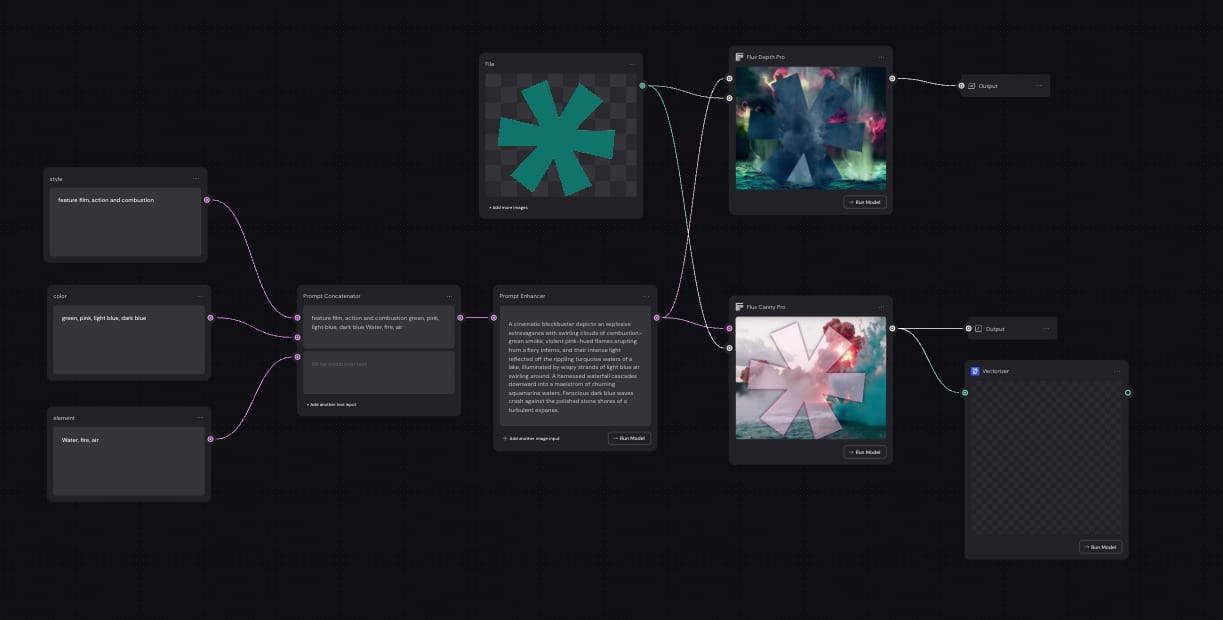 A simple pipeline in Weavy, text and imagery combine to create fresh imagery