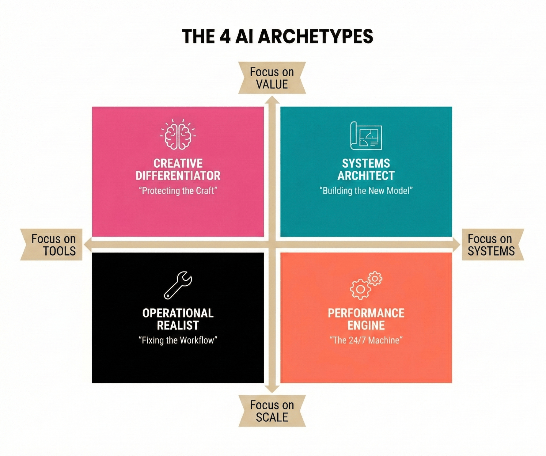 To make sense of these 100+ conversations, we plotted every leader’s vision along two critical strategic axes. First, the Value vs. Scale Axis: are you using AI to elevate the quality of your output (better work), or are you focused on the volume and efficiency of your existing output (more work)? Next, the Tools vs. Systems axis: are you empowering individuals with AI tools to use at their discretion, or are you re-engineering your business around proprietary systems? When these two tensions come together, four distinct archetypes emerge. Each represents a different philosophy on the future of work: