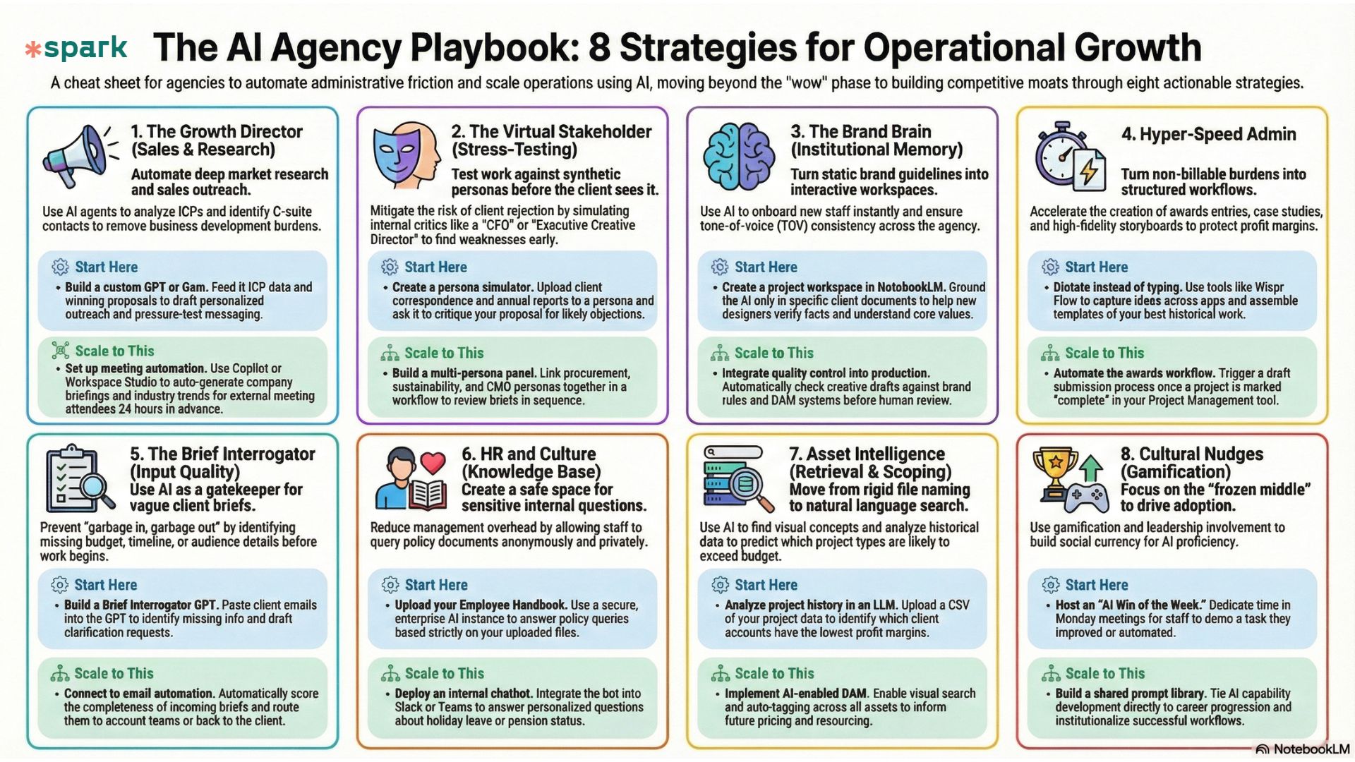 So this year's guide is different. Rather than focusing on what AI could do, I’m highlighting what is actually working - what we are seeing across agencies we talk to and work with. I’ll share 8 proven workflows and strategies people are implementing right now. And for each each I’ll give you a two step roadmap: we see agencies start here, then scale there. Scroll down for a free cheatsheet download too.
