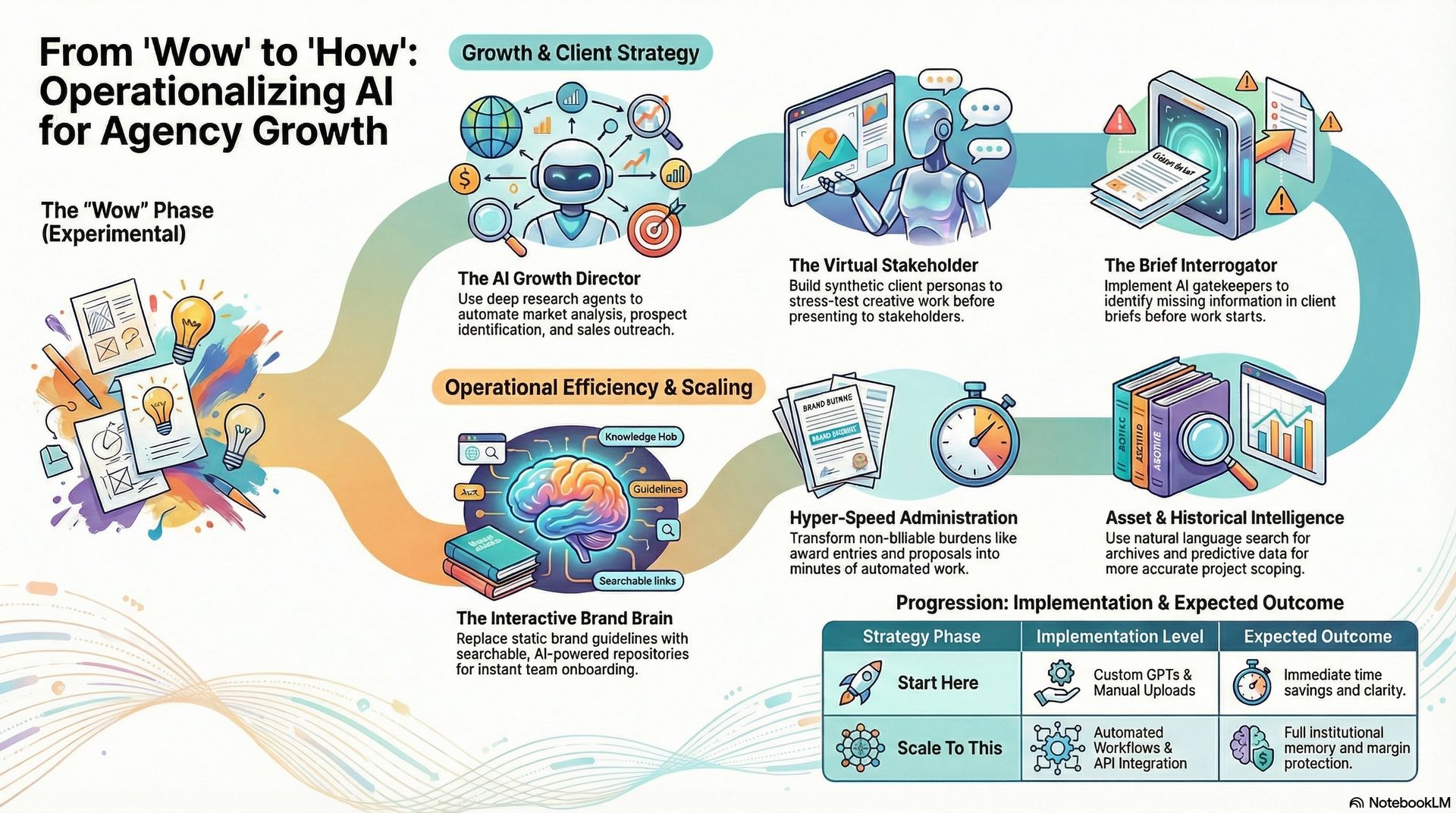 We've moved past the "wow" phase of AI and into the "how" phase. The most progressive agencies are now operationalising AI and creating a new moat from their competitors. They're building virtual stakeholders, simulating difficult clients, and automating the administrative grind are part of their day-to-day workflows.